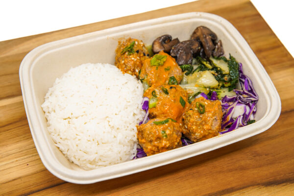 Korean BBQ style grass-fed beef meatballs served w/ steamed jasmine rice (or roasted butternut squash), shaved red cabbage, baby bok choy & cremini mushrooms.