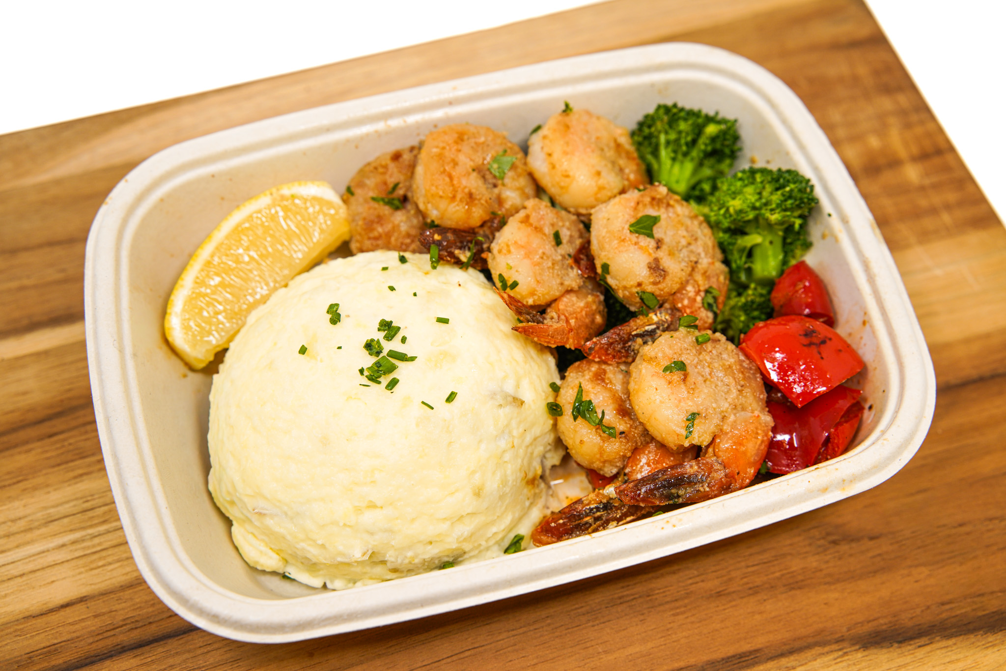 Sustainably-sourced lemon garlic shrimp served w/ creamy Yukon gold mashed potatoes (or garlic cauliflower mash), seared red bell peppers & steamed broccoli.
