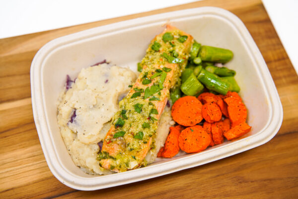 Sustainably sourced salmon roasted in zesty verde sauce, served with creamy mashed red potato (or garlic cauliflower mash), served with grilled asparagus and roasted carrots.