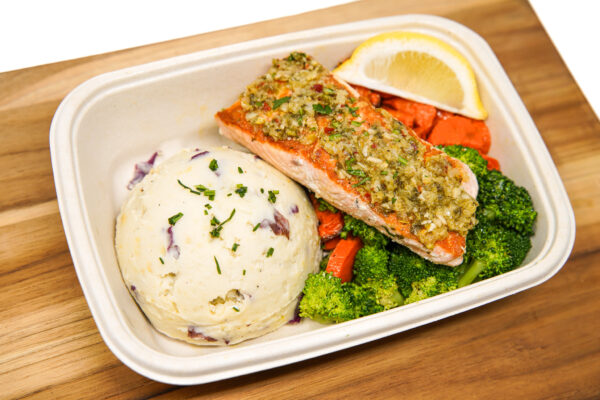 Sustainably sourced salmon roasted in zesty verde sauce and served with creamy mashed red potato or garlic cauliflower mash. This balanced, healthy meal is paired with steamed broccoli and roasted carrots for a well-rounded, flavorful entrée made with clean ingredients and thoughtful preparation.
